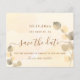 Um fundo de cor aquosa ouro decorado com folhagem de eucalipto ouro. Personalize e adicione a data, o local e seus nomes. Letras coloridas com ouro. O texto: Salvar a Data é gravado com um script de estilo com letra de tendência grande.