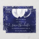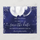 Um cartão de salvar a data feminino e moderno para uma festa de aniversário de 16 anos, Sweet 16. Um fundo azul marinho irregular. Decorado com brilho prateado falso e balões brancos. O texto: Salve a data é escrito com uma fonte manuscrita moderna e grande.