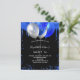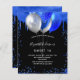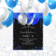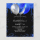 Uma menina e feminina Doce 16, 16º convite de aniversário. Na frente: Um fundo preto chic. Decorado com pingos de brilho azul-real, aparência pingando tinta e balões. Personalize e adicione um nome e detalhes da parte. O nome é escrito com um script de estilo manuscrito.