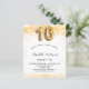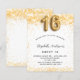 Para uma elegante festa de aniversário 16, 16. Um fundo branco chic. Decorado com brilho de ouro falso, brilhos. Personalize e adicione um nome, idade e detalhes da festa. O nome é escrito com um script de estilo manuscrito. Número 16 com letra de estilo de balão.