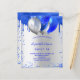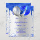 Uma menina e feminina Doce 16, 16º convite de aniversário. Na frente: um fundo falso prateado. Decorado com pingos de brilho azul-real, aparência pingando tinta e balões. Personalize e adicione um nome e detalhes da parte. O nome é escrito com um script de estilo manuscrito.
