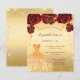 Um convite moderno, na moda e glamouroso para uma doce festa de aniversário 16, 16. Um fundo de ouro falso com pó de ouro falso, um vestido e rosas vermelhas, florais. O nome é escrito com um moderno estilo escrito à mão. Personalize e adicione os detalhes da sua festa.