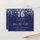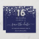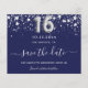 Uma garota e moda Salve o cartão de data para uma doce festa de aniversário 16, 16. Um fundo azul marinho colorido. Decorado com estrelas de falso prata. O texto: Salvar a Data é gravado com um script de estilo com letra de tendência grande. O número 16 é escrito com uma fonte no estilo do balão.