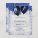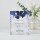 Um convite de aniversário feminino e feminino. Na frente: um fundo falso prateado. Decorado com gotas de brilho azul marinho, aspecto de pingar tinta e balões. Personalize e adicione um nome e detalhes da parte. O nome é escrito com um script de estilo manuscrito.