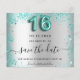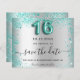 Uma garota e moda Salve o cartão de data para uma doce festa de aniversário 16, 16. Um fundo com aparência de prata falsa, decorado com pó brilhante verde e lacrimejante. Personalize e adicione uma data e nome/idade. O texto: Salvar a Data é gravado com um script de estilo com letra de tendência grande. Número 16 com uma fonte no estilo do balão.