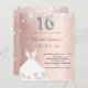 Um convite moderno, na moda e glamouroso para uma doce festa de aniversário 16, 16. Um fundo metálico rosa dourado falso, com poeira brilhante prateada falsa e um vestido. O nome é escrito com um moderno estilo escrito à mão. O número 16 é escrito com uma fonte no estilo do balão. Personalize e adicione os detalhes da sua festa.