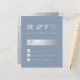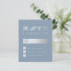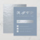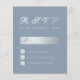 Um RSVP econômico elegante para um casamento. com cores de casamento dusty blue e prata. O fundo é dusty blue. O título RSVP é de falso papel alumínio prateado, o resto do texto é cinza prateado, exceto a letra M, que é dusty blue. O título RSVP e a letra M são escritos em uma fonte caligráfica elegante, o resto em maiúsculas. A caixa retangular para o nome, as pequenas caixas quadradas e a parte de trás são de falso papel alumínio prateado.