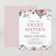 Orçamento Personalize este Rosa Dusty Blush Pink Mauve, e White Elegante e Na moda Floral Watercolor Sweet Dezesseis Convites de aniversário sobre fundo branco com sua mensagem e detalhes. Este convite para na moda inclui flores rosa e verde botânico do eucalipto moderno com tipografia elegante e elegante é perfeito para a Celebração de Aniversário do 16 Doce.