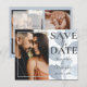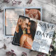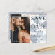 Elegante anúncio de save the date em azul empoeirado é perfeito para colocar seus planos de casamento em movimento. Apresenta um modelo de foto exclusivo e tipografia 'save the date' grande com a adição de um grande motivo de eucalipto, tudo em um fundo branco. Personalize com seus próprios detalhes.
