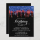 Convide amigos e familiares para a sua festa de aniversário com esses convites de festa de aniversário com gotas de glitter patrióticas pretas, vermelhas e azuis elegantes e suprimentos para festas. Este convite de aniversário vermelho, azul e preto também é perfeito para festas e celebrações de aposentadoria e formatura, basta alterar o evento na guia de personalização. Esta coleção de aniversário com tema de bandeira americana dos EUA será um favorito entre todos os militares, veteranos, policiais e forças armadas, bem como eventos empresariais e corporativos. Visite nossa coleção de aniversário patriótico para convites de aniversário vermelhos, brancos e azuis, brindes de aniversário e suprimentos para festas. COPYRIGHT © 2020 Judy Burrows, Black Dog Art - Todos os direitos reservados. Convite de Aniversário Patriótico Elegante com Glitter Vermelho e Azul