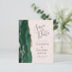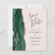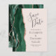 A borda esquerda deste elegante casamento moderno salve o cartão de data apresenta uma esmeralda verde aquarela agate bordada com falsa rosa dourada. O texto personalizável combina a escrita manual de cinzas de carvão, fontes em copperplate e itálico em um fundo cor-de-rosa pincelado. O verso apresenta um design emerald verde e rosa dourado.