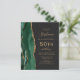 A borda esquerda deste elegante e moderno convite de aniversário 50º apresenta uma esmeralda verde aquarela agate borda com brilho dourado. O texto personalizável combina manuscrito dourado, fontes em copperplate e itálico em um fundo preto de slate. O verso apresenta um design emerald verde e dourado.