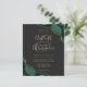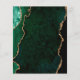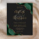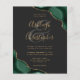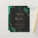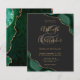 Um desenho de ágata esmeralda esverdeada com glitter dourado falso aparece em dois cantos deste design elegante. Personalize com os nomes do casal em escrita à mão dourada sobre um grande e comercial. Adicione os detalhes do casamento em fontes de cobre dourado e itálico sobre um fundo preto de ardósia. O verso apresenta um design de ágata verde e dourado correspondente.