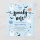 O orçamento assusta um convite de festas de primeiro aniversario de Halloween de um fantasma de bebê azul. Design moderno do Dia das Bruxas para uma festa assustadora! Este convite de aniversário inclui teias de aranha, fantasmas, abóboras, morcegos, aranhas, folhas, cornas, estrelas e margaridas. Este convite é excelente para garotinhos!