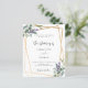 Um fundo branco na moda na frente. Decorado com eucalipto e lavandas florais. Um quadro geométrico dourado. Personalize e adicione seus nomes e detalhes. Fundo: fundo colorido de cinza verde.