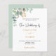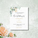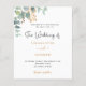 Um fundo branco chic. Decorados com folhas de eucalipto, prigos, verde e dourado, de cor aquosa verde. Personalize e adicione seus nomes e detalhes do casamento. Letras negras. Verso: cor verde do fundo.