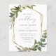 Este elegante convite de casamento rústico apresenta uma estrutura geométrica de folha falsa de ouro decorada com eucalipto e verde de azeitona. A palavra "casamento" aparece em escrita caligráfica. Personalize o texto da cinza de carvão com os nomes da noiva e do noivo e os detalhes do casamento na frente, e suas iniciais e URL do site no verso.