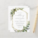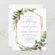 Este elegante convite de casamento rústico apresenta uma estrutura geométrica de folha falsa de ouro decorada com eucalipto e verde de azeitona. A palavra "casamento" aparece em escrita caligráfica. Personalize o texto da cinza de carvão com os nomes da noiva e do noivo e os detalhes do casamento na frente, e suas iniciais e URL do site no verso.