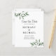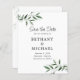 Saídas de Eucalyptus Delicadas no Orçamento com Código QR Sombra Salve o Anúncio de Data... A frente do nosso barato botânico Save the Date card apresenta ramos delicados de folhas verdes de eucalipto embelezadas com sua sombra semitransparente. Entre as galerias estão os detalhes do seu anúncio de casamento em itálico elegante e tipografia serif. Na parte de trás do cartão estão seu endereço de devolução, URL do site do casamento e um exemplo gráfico de código QR que você pode substituir facilmente pelo seu próprio site do casamento Código QR - na modelo de personalização. Todo o texto de exemplo em ambos os lados da placa pode ser facilmente revisado com seus próprios detalhes no modelo de personalização.