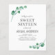 Orçamento Personalize este moderno estilo de Primavera de Folhagem Eucalyptus de Molerce de Aquarela Estilo Doce Dezesseis convites de festas sobre fundo branco com sua mensagem e detalhes. Este convite para na moda inclui uma folhagem botânica elegante e moderna, com a tipografia de na moda com script, é perfeita para as celebrações de Festas de aniversário Doce 16