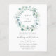 Belo convite para o casamento de eucalipto verde com bonito coroa feita de folhas verdes frescas de eucalipto. Este design elegante e arejado é perfeito para casamentos de primavera e verão.