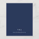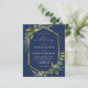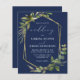 Este elegante convite de casamento rústico apresenta uma estrutura geométrica de folha falsa de ouro decorada com eucalipto e verde de azeitona em fundo azul-marinho. A palavra "casamento" aparece em escrita caligráfica. Personalize o texto branco com os nomes da noiva e do noivo e os detalhes do casamento na frente, e suas iniciais e URL do site no verso.