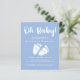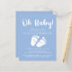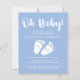 Um convite para o chá de um bebê azul, bonito e econômico, com "Oh Baby!" em um roteiro branco e uma coordenação da cor branca dos pés dos bebês. Você pode personalizar facilmente os detalhes do chá.