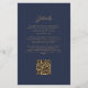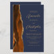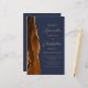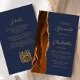 A borda esquerda deste convite de casamento moderno e elegante apresenta uma borda de ágata em aquarela laranja queimada e ferrugem aparada com brilho dourado falso. O texto personalizável combina fontes douradas em script e sem serifa em um fundo azul-marinho. O verso fornece espaço para detalhes do casamento em um fundo preto ardósia sólido, juntamente com um código QR que os convidados podem digitalizar para visitar seu site e responder, o que economiza o custo de impressão e envio de cartões de resposta separados.