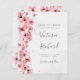 Um cartão moderno e elegante de salvar a data do casamento floral com flores de cerejeira em aquarela rosa e caligrafia moderna em uma textura de papel artesanal.