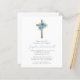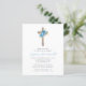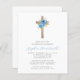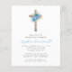Este elegante convite batismo apresenta um buquê de aquarela de flores azuis e folhagem dourada numa simples cruz de madeira, acima das palavras "por favor juntem-se a nós para o batismo da nossa filha" em carvões de cinza de carvão. Personalize-o com seu nome em delicada caligrafia azul, com os detalhes em serifa de cinza em fundo branco. Ideal para o batismo de uma garota.