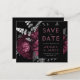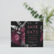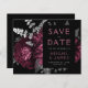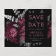 Este elegante e melancólico casamento Salve o cartão da data apresenta um buquê floral romântico e luxuoso em vermelho burgundy com folha de papel e folhagem reluzente em um fundo preto. Personalize a cinza prateada e o texto pálido de burgundy em fontes na moda num retângulo preto, e adicione o URL do site de casamento ao fundo preto sólido.