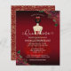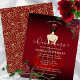 Este elegante convite Quinceañera apresenta uma garota de vestido vermelho com sotaques florais de vermelho e ouro. A parte traseira apresenta o padrão vermelho e rosa dourado. Fácil de personalizar clicando em "Personalizar".