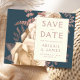 Este elegante casamento Salve o cartão de datilografia apresenta um buquê floral robusto e romântico em marfim com folha de ouro rosa e folhagem brilhante num fundo azul teal. Personalize o texto rosa em fontes na moda em um retângulo de marfim e adicione o URL do site de casamento ao retângulo sólido.