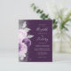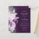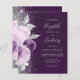 A borda esquerda deste convite de casamento moderno e elegante apresenta um buquê floral em tons de roxo e lavanda, aparado com folha de alumínio falsa prateada e folhagem de brilho falsa e polvilhado com brilho falso prateado. O texto personalizável combina fontes de escrita à mão em cinza prateado claro, cobre e itálico em um fundo roxo. O verso apresenta um design floral roxo e prateado correspondente.