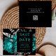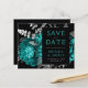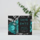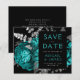 Este elegante e melancólico casamento Salve o cartão da data apresenta um buquê floral romântico e luxuoso em azul verde com folha de cor prateada e folhagem brilhante num fundo preto. Personalize a cinza prateada e o texto nominal em fontes na moda num retângulo preto. Adicione detalhes adicionais na parte de trás e insira o URL do seu site de casamento para gerar um código QR.