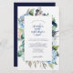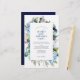 O convite para casamento. Design de casamento russo de aquarela com belo buquê floral de hidrangea azul, flores de anêmona azul e branca, folhas de eucalipto, dália e verde. Marinho, letras brancas. Ideal para casamento rústico, casamento de verão.
