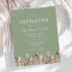 Uma bela borda floral de aquarela de flores silvestres decora a borda inferior deste convite de festa de formatura de vassouras. Personalize o texto branco em um plano de fundo verde sábio com o nome do formando em script de escrita manual; o ano escolar e de classe em sans serif; e os detalhes de data, local e RSVP em fonte de serif. A parte traseira da placa é verde estável.