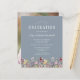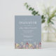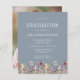 Uma bela borda floral de aquarela de flores silvestres decora a borda inferior deste convite de festa de formatura de vassouras. Personalize o texto branco em um fundo azul empoeirado com o nome do formando em script de escrita manual; o ano escolar e de classe em sans serif; e os detalhes de data, local e RSVP em fontes serif. Substitua facilmente a imagem de exemplo no verso por uma foto vertical do seu formando.