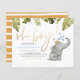 Um chá de fraldas moderno e orçamental convida à selva ou aos acontecimentos temáticos dos elefantes! A frente do design apresenta "oh boy!" em letras douradas com os detalhes da sua festa abaixo. À direita, há um elefante de aquarela pintado manualmente vestindo uma pequena coroa de ouro e esparramando água sobre si mesmo. No topo, há folhas da selva e verde. No fundo, há uma falsa lamúria de ouro. Cartões invertidos a uma cor amarela mostarda em negrito com riscas brancas desenhadas à mão. Clique em "Personalizar" para alterar o texto. Como parte da seleção orçamentária no Zazzle, esta folha não é um tamanho de convite padrão ou qualidade de papel. Se quiser que este design num cartão de convite o encontre na nossa loja ou utilize o Zazzle Make Machine para o transferir para o produto da sua escolha. Visite nossa loja para obter mais designs e verifique a coleção abaixo para ver os itens correspondentes!