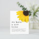 Girassol Amarelo Movendo Novos Detalhes Domésticos. Um alternativo SMALLER de 4,5" x 5,6", compatível com o orçamento, para aconselhar seu novo endereço. Disponível em um STOCK de PLACA SEMI GLOSS 110 lb ou um STOCK de PAPEL THINNER SATIN FINISH 80 lb. Os envelopes são um extra opcional. O cabeçalho é grande em na moda lowercase com os detalhes abaixo. Um girassol amarelo parcial decora o canto superior direito. Personalize facilmente o texto para seus próprios detalhes.