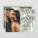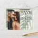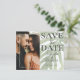 Elegante, salvar o anúncio de data é perfeito para pôr em marcha seus planos de casamento. Apresenta um modelo fotográfico e uma grande tipografia 'salvar a data' com a adição de uma folha monstera ampliada pintada em aquarela, tudo sobre fundo branco. Personalize com seus próprios detalhes.
