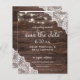 ** SATIN PAPER É PAPEL FINO. ATUALIZE O PAPEL PARA OBTER UM PAPEL MAIS ESPESADO. TEM UMA OPÇÃO PARA ENVELOPES. *** Economize dinheiro em convites formais com este convite menor que tem uma opção para envelopes. Prepare seus convidados para o maravilhoso casamento com seus Cartões salve a data Fotográficos de madeira, rendas e luzes. Quer uma versão maior? Confira a coleção Salvar Data para cartões: https://www.zazzle.com/collections/save_the_date_collection-119001127515543544?rf=238937196885903396