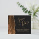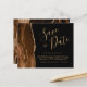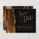 Este elegante orçamento salva o cartão de data apresenta uma cor d'água marrom mocha, borda agata, aparada com falso brilho dourado. O texto personalizável combina um script de escrita manuscrita dourada, fontes copperplate e itálico em um fundo preto. O verso apresenta um design de agate marrom e dourado.