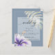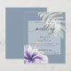 Barato Rustic Watercolor Hibiscus e Convite para Casamento Foliar | NOVO! Convites para Casamento Leve do barato - uma flor púrpura e lilás de hibisco tropical e um adorno de folha verde e uma folha de filodendron dividida adorna diagonal oposta a ambos, borrado em ouro cintilante, tudo colocado sobre um fundo azul empoeirado com uma camada branca esbranquiçada para que o texto seja facilmente lido e, no entanto, permita que o design apresente - bela caligrafia manuscrita - fácil de personalização - modelo - design original por ©WhimsicalArtwork™ para o BarefootBride ™. Esta é parte da nossa coleção de casamento Tropical de Hibiscus Watercolor, assim como Chás de fraldas, Aniversário e Convites de Natal. Para perguntas ou assistência, entre em contato com o designer indy.designer@yahoo.com.