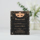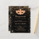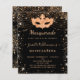 Para uma elegante Mascarada, Quinceañera, 15º aniversário. Um fundo preto elegante. Decorado com pó de brilho dourado falso e uma máscara de mascarada. Personalize e adicione um nome, idade e detalhes da festa. O nome é escrito com um estilo de letra manuscrita