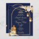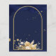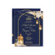Lanternas marroquinas estreladas do orçamento do ouro noturno Mehndi convite. Fundo azul escuro com flores secas arranjos em cantos com lanternas suspensas.