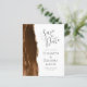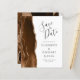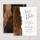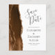 A borda esquerda deste elegante casamento moderno salve o cartão de data apresenta uma mocha marrom aqueteira agate borda com falsa brilho dourado. O texto personalizável combina a escrita manual de cinzas racoais, as fontes em copperplate e itálico em um fundo branco. O verso apresenta um design de agate marrom e dourado.