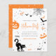 Apresentando nosso na moda orçamental de Halloween Party Convite! Abraçar o encantamento estranho da noite com morcegos graciosamente soprando, uma abóbora maliciosa gritando, um gato, uma teia de aranha delicadamente fiada, e uma aranha acrescentando seu toque assustador. Contra um cenário branco elegante, a tipografia moderna em elementos negros e laranja acrescenta uma reviravolta contemporânea. Junte-se a nós para uma noite inesquecível de emoções e arrepios!