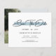 Cartão de Convite Orçamento Moderno Minimalista Roteiro Salvar Data apresenta "Salvar Data" em um elegante roteiro preto sobre um acento azul moderno em um fundo branco com as informações de Salvar Data abaixo. Personalize editando o texto nas caixas de texto fornecidas e adicionando sua foto favorita ao verso. Criado para você por ©Evco Studio www.zazzle.com/store/evcostudio