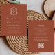Este elegante design de convite de casamento inspirado em vintage apresenta um par de iniciais monográficas brancas em letra serif aberta acima e abaixo de uma linha divisória e rodeadas por uma crista botânica de arte em linha num fundo de terracota. O verso fornece espaço para detalhes do casamento em um fundo de terracota sólido, junto com um código QR que os convidados podem digitalizar para visitar seu site e RSVP.
